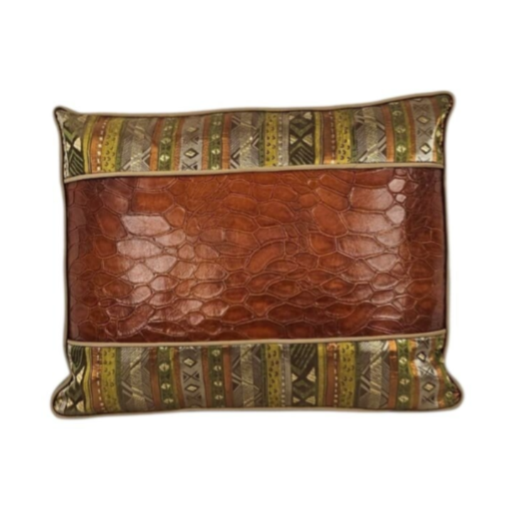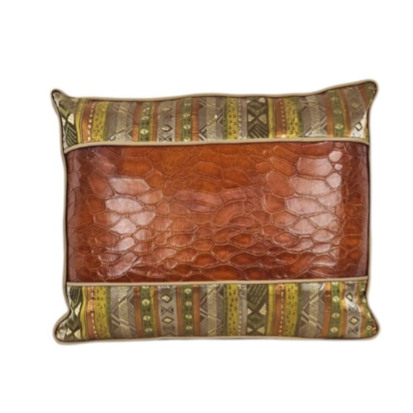 Dit kussen is een kunstwerk op zich, gemaakt van leer uit Italie, dat bewerkt is zodat het de uitstraling van een krokodil heeft, daarnaast is er gebruikt gemaakt van een luxe zijde. De gouden piping maakt het helemaal af, waardoor het één geheel wordt.
