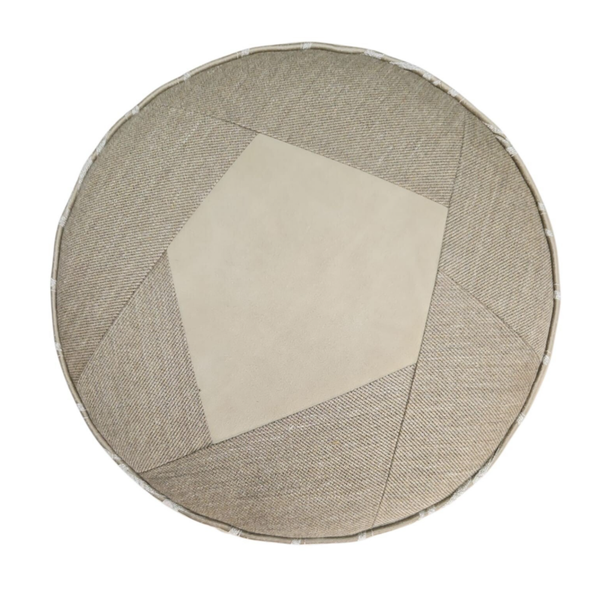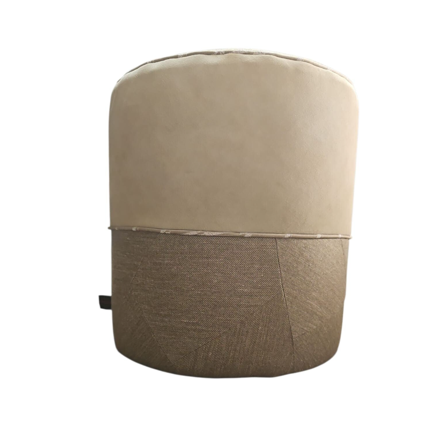 De poef is een stijlvolle mix van luxe materialen, met zandkleurig suède als basis en een subtiel spel van texturen dat warmte en elegantie uitstraalt. De rand is afgewerkt met een bronzen piping, terwijl elk vlak zorgvuldig is vormgegeven voor een verfijnde, luxueuze uitstraling.