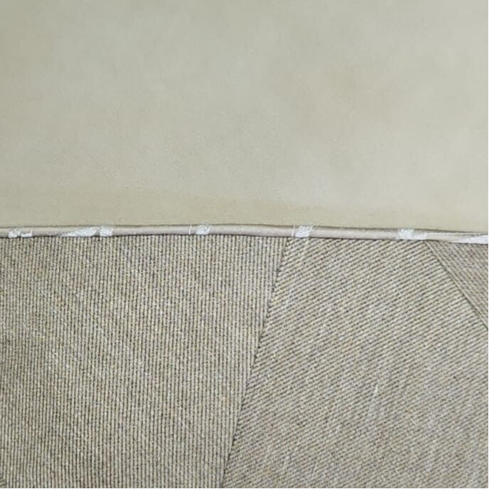 Voorzijde: zandkleurig suède, afgewerkt met een bronzen piping, gecombineerd met een donker zandkleurige meubelstof in een speels puzzelpatroon.