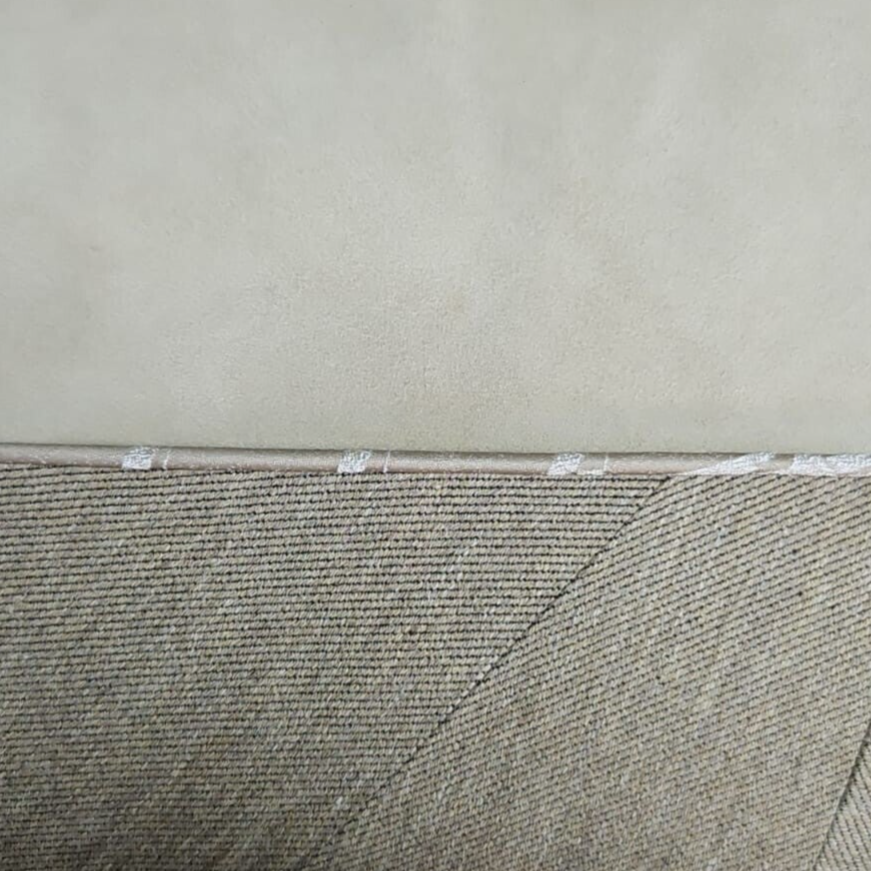 Voorzijde: zandkleurig suède, afgewerkt met een bronzen piping, gecombineerd met een donker zandkleurige meubelstof in een speels puzzelpatroon.