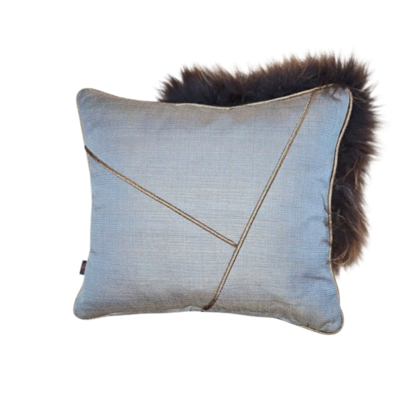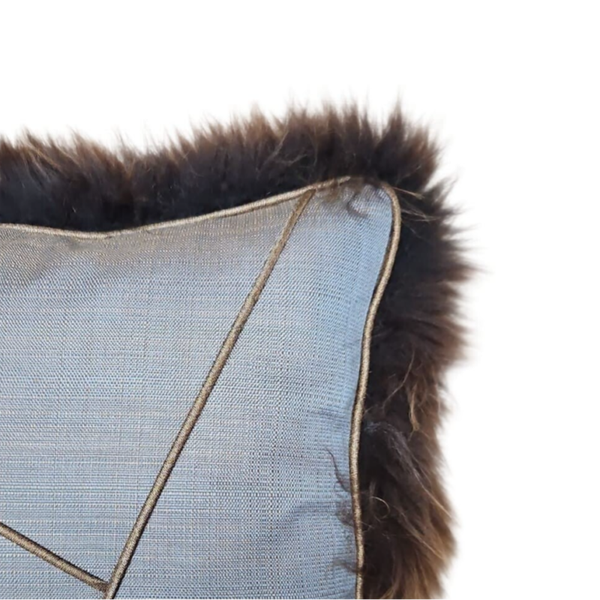 Voorzijde: Schapenvacht in donkerbruin met bronze highlight, gecombineerd met een geweven meubelstof van brons/lichtgrijze garens, afgewerkt met een bronze metallic piping.