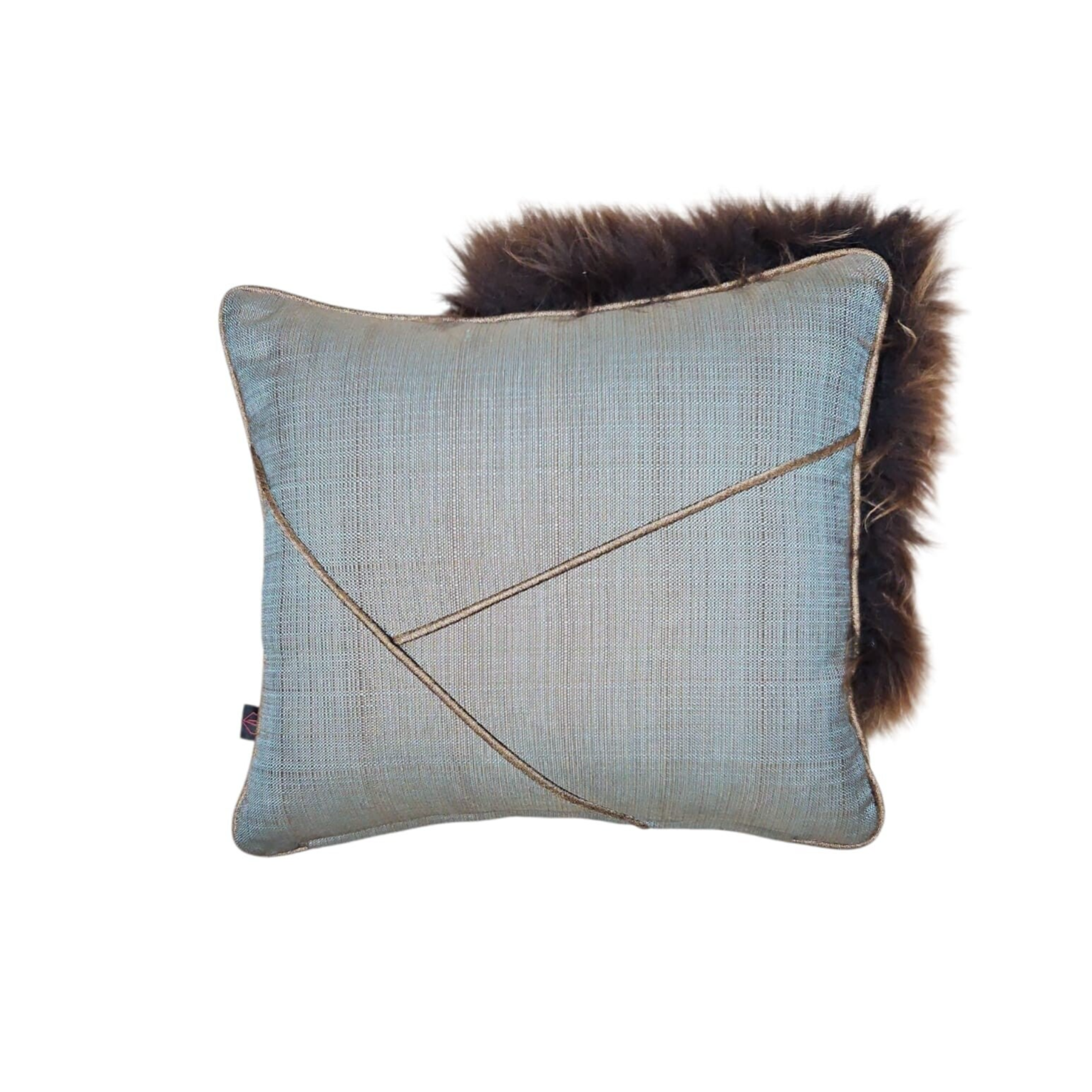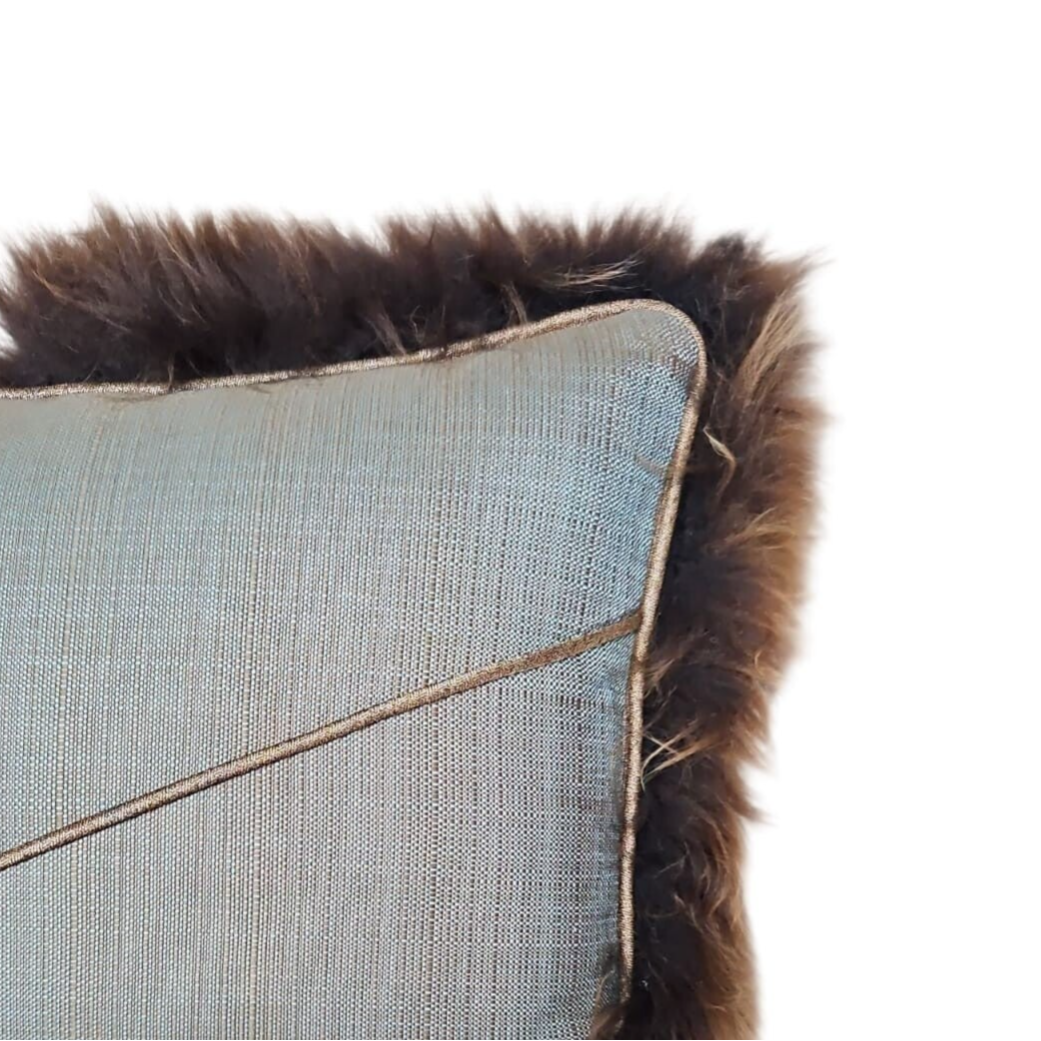 Voorzijde: Schapenvacht in donkerbruin met bronze highlight, gecombineerd met een geweven meubelstof van brons/turquoise garens, afgewerkt met een bronze metallic piping.