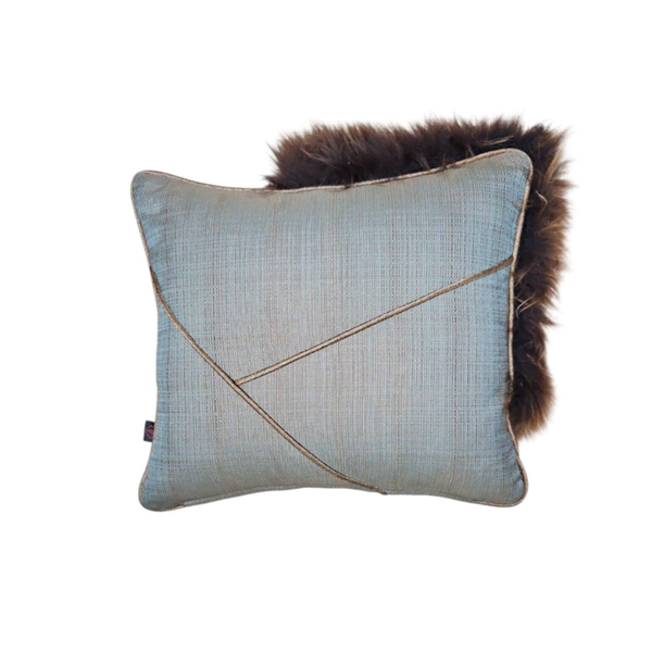 Donkerbruine schapenvacht met een bronze highlight vormt de basis van kussen Éwé. In combinatie met een geweven meubelstof van brons- en turquoise garens ontstaat een opvallend en rijk kleurenspel. De toegepaste puzzle-techniek geeft dit kussen een chique én speelse uitstraling, terwijl de metallic piping het geheel elegant afrondt. Een exclusief ontwerp dat warmte, stijl en tijdloosheid uitstraalt.