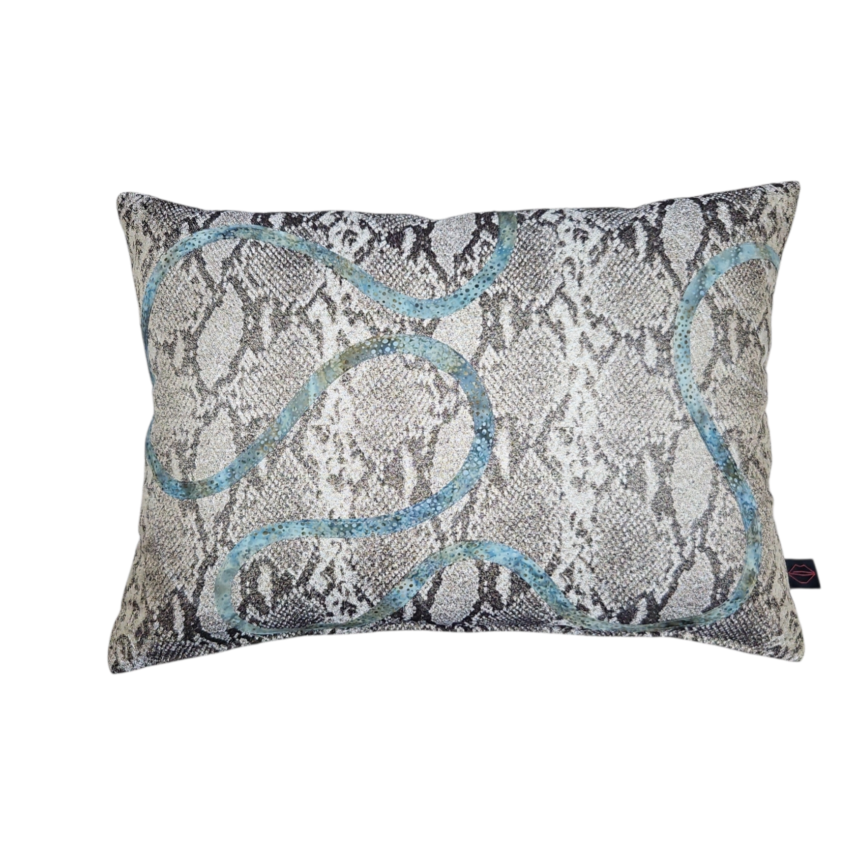 Achterzijde: meubelstof in slangprint. Katoen gekleurd met eucilineverf en verwerkt tot een biasband die het kussen sierlijk afwerkt.