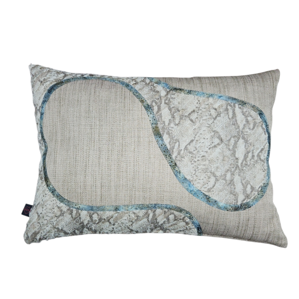 Voorzijde: beige meubelstof met een geslicde voile van slangprint. Katoen gekleurd met eucilineverf en verwerkt tot een biasband die het kussen sierlijk afwerkt.