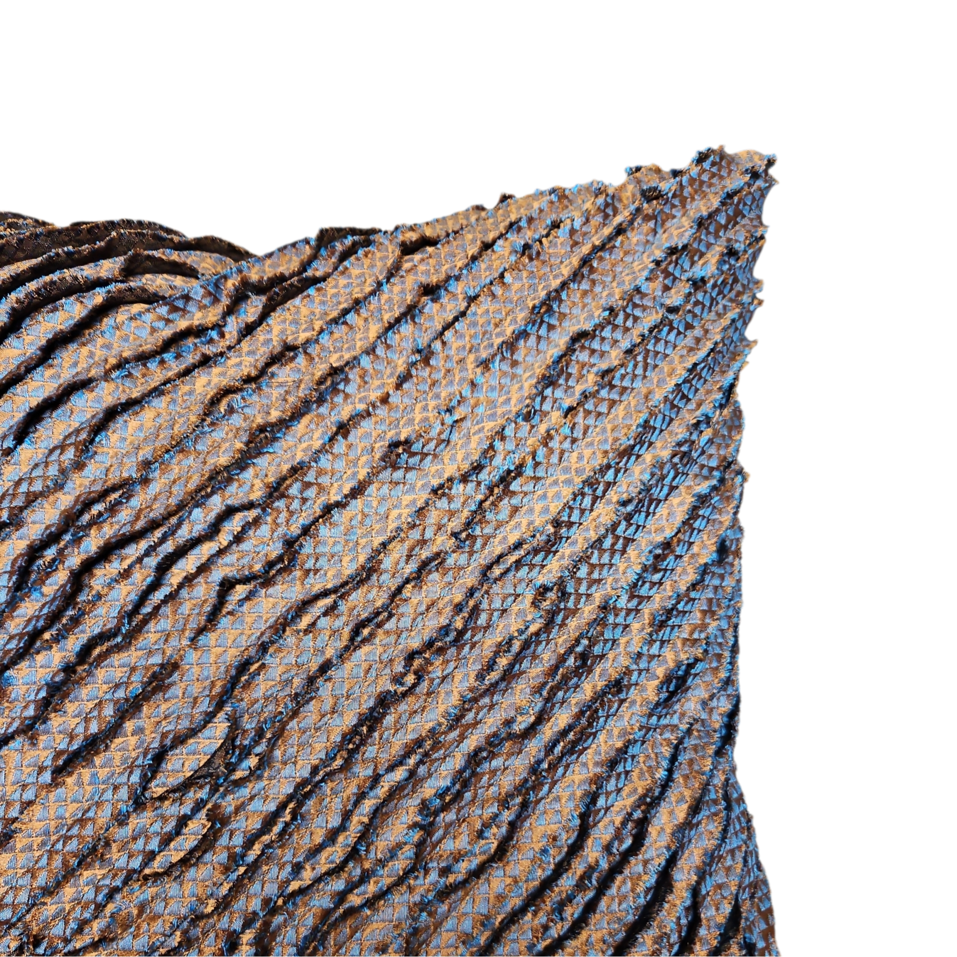 Danse Cuivrée is een kussen dat leeft. Door het zorgvuldig slicen van de stof ontstaat extra beweging en diepte, waardoor koperen en turquoise tinten bij elke lichtinval lijken te dansen. De achterzijde van zachte wol in een petrolkleur vormt een warm en elegant contrast. Een verfijnd statementstuk met karakter.